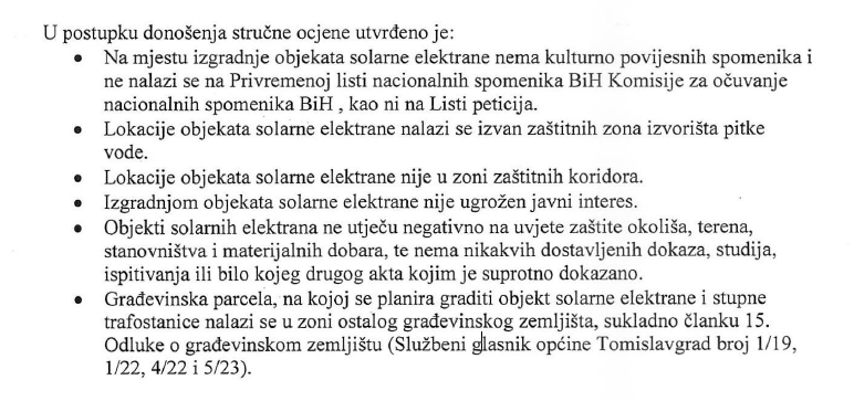 U prostorno-planskim uvjetima stoji da “izgradnjom objekta solarne elektrane nije ugrožen javni interes” i da se lokacija ne nalazi u zoni zaštitnih koridora.