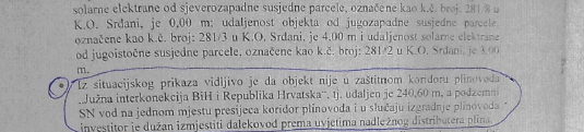 U dokumentu stoji da objekt nije u zaštitnom koridoru plinovoda “Južna interkonekcija BiH i Republika Hrvatska”, no da je udaljen svega 240,60 metara od njega, dok podzemni SN vod na jednom mjestu presijeca koridor. U slučaju gradnje plinovoda, investitor bi, prema uvjetima nadležnog distributera, bio obvezan izmjestiti dalekovod – što jasno pokazuje da je planirana lokacija već tada bila u koliziji s postojećim infrastrukturnim planovima.